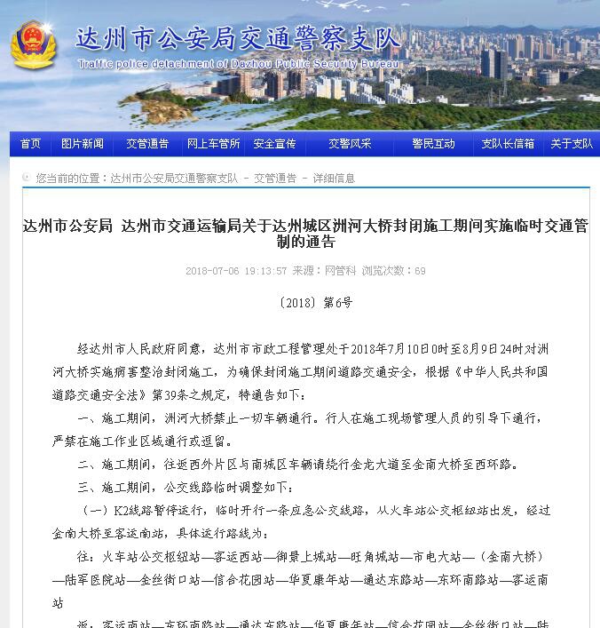 經(jīng)達(dá)州市人民政府同意,達(dá)州市市政工程管理處于2018年7月10日0時(shí)至8月9日24時(shí)對(duì)洲河大橋?qū)嵤┎『φ畏忾]施工,為確保封閉施工期間道路交通安全,根據(jù)《中華人民共和國(guó)道路交通安全法》第39條之規(guī)定,特通告如下: