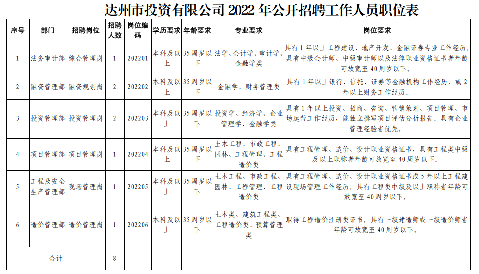 本次公開招聘設(shè)置崗位6個(gè),擬招聘工作人員8人,其中:法務(wù)審計(jì)部1人、融資管理部2人、投資管理部2人、項(xiàng)目管理部1人、工程及安全生產(chǎn)管理部1人、造價(jià)管理部1人。